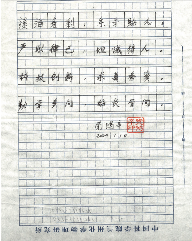 去世前一年,黨鴻辛的身體已經(jīng)非常虛弱。2004年7月10日,中國科學(xué)院蘭州化學(xué)物理研究所領(lǐng)導(dǎo)和他的學(xué)生去醫(yī)院看望,黨鴻辛躺在病床上,在一張稿紙上寫下遺訓(xùn):