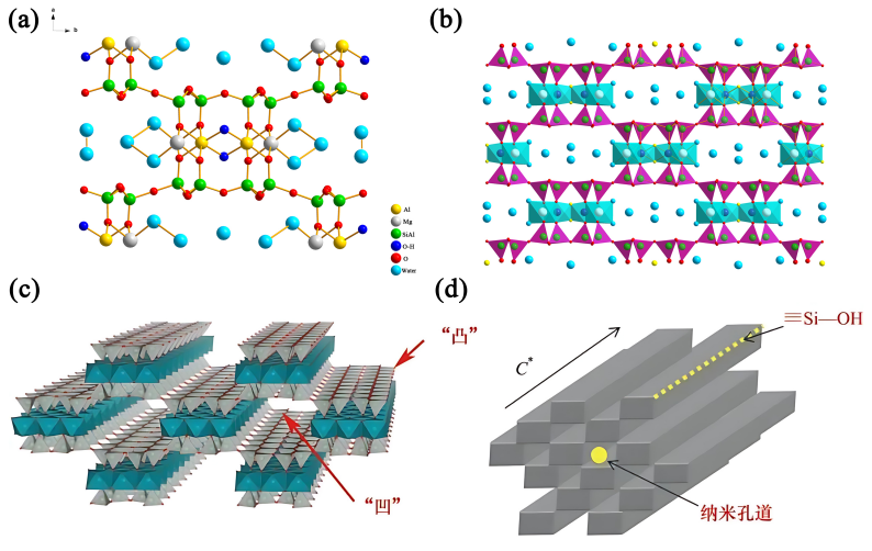凹凸棒石晶體結(jié)構(gòu)(a, b)和孔道結(jié)構(gòu)(c, d)示意圖(圖片來源:中國科學(xué)院蘭州化學(xué)物理研究所)