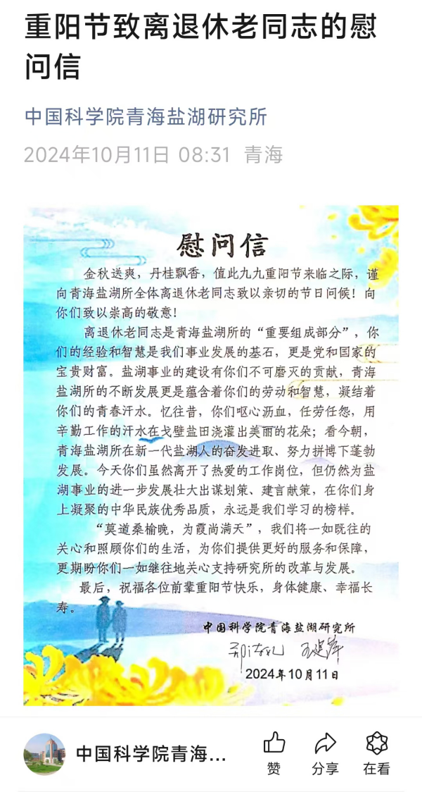 歡度重陽節(jié),共敘夕陽情。本次重陽節(jié)活動不僅讓離退休職工在美景、詩詞和美食中度過了一個愉快的節(jié)日,更讓他們感受到了研究所與社會的關愛和尊重。青海鹽湖所將一如既往地關心、關愛離退休老同志,讓他們安享幸福美滿晚年,不斷傳遞尊老敬老正能量,為構(gòu)建和諧社會貢獻力量。