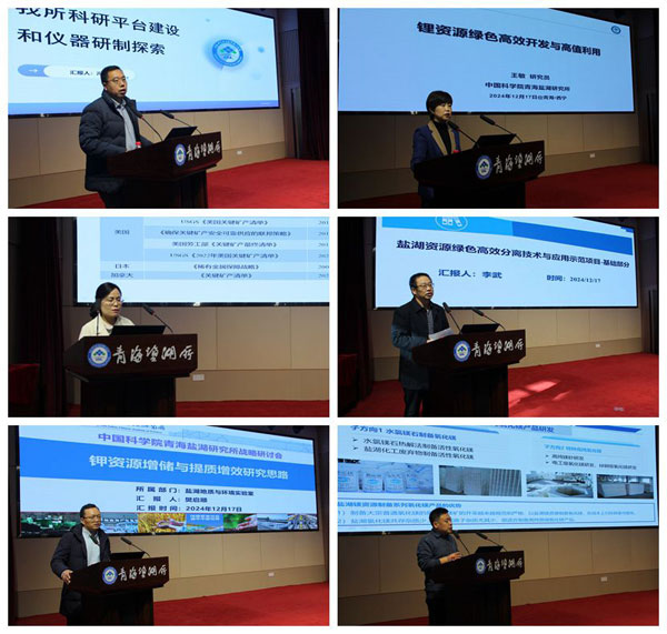 大會開始,鄭詩禮副所長(主持工作)首先介紹了召開此次戰(zhàn)略研討會的背景和意義。隨后,李武研究員、樊啟順研究員、王敏研究員、葉秀深研究員、劉海寧研究員及副所長馮海濤研究員圍繞鹽湖化學(xué)基礎(chǔ)研究、鉀資源增儲、鋰高效分離、鎂基結(jié)構(gòu)材料、鹽湖稀散元素和儀器設(shè)備平臺開發(fā)六個方向分別以《鹽湖資源綠色高效分離技術(shù)與應(yīng)用示范項目-基礎(chǔ)部分》《鉀資源增儲與提質(zhì)增效研究思路》《鋰資源綠色高效開發(fā)與高值利用》《強化關(guān)鍵科學(xué)與技術(shù)攻關(guān)加快推動鹽湖鎂產(chǎn)業(yè)多元化高值化發(fā)展》《鹽湖銣銫溴碘硼高值元素資源增儲與分離提取》《青海鹽湖所科研平臺建設(shè)與儀器研制探索》為題作報告。