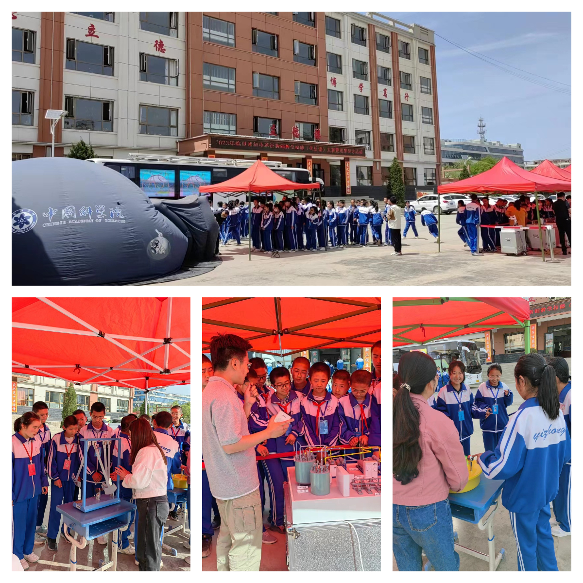 在為期七天的活動(dòng)中,“科學(xué)快車”以球幕影院、車廂內(nèi)互動(dòng)展廳、戶外可移動(dòng)展區(qū)等多種形式向同學(xué)們展示了中科院近年來(lái)重大創(chuàng)新科技成果,通過(guò)豐富多彩的展品、利用沉浸式環(huán)境和交互式手段,讓青少年在參與和互動(dòng)中體驗(yàn)到神奇的科技世界:在球幕影院,360度球幕科普微電影讓同學(xué)們直觀感性體驗(yàn)了科學(xué)探索太空、科學(xué)和諧自然、科學(xué)服務(wù)人類,領(lǐng)略了神奇的科技魅力,激發(fā)了偉大的科技?jí)粝?,球幕影院不時(shí)傳出孩子們的驚嘆與歡笑聲;在車廂內(nèi)互動(dòng)展廳,深空、深海、深地和深藍(lán)四個(gè)領(lǐng)域的科研成果深深吸引了同學(xué)們的眼球,他們有的小聲地與身邊的伙伴交流著,有的聚精會(huì)神地閱讀展板上的介紹文字,特別是當(dāng)同學(xué)們帶上VR眼鏡時(shí),可身臨其境的體驗(yàn)“深海探險(xiǎn)”,孩子們歡呼雀躍、意猶未盡;在戶外可移動(dòng)展區(qū),通過(guò)科普志愿者的精彩講解,同學(xué)們近距離觀察了中國(guó)空間站互動(dòng)模型、天地一體化量子信息通信網(wǎng)絡(luò)樣機(jī)模型、智能制造機(jī)械臂模型、大型低溫制冷裝備模型、人工合成淀粉模型和人造太陽(yáng)裝置模型等近年來(lái)中科院重大創(chuàng)新成果的模型展品,并且親自體驗(yàn)了“會(huì)跳高的珠子”、“磁阻尼演示儀”和“溫柔的電擊”等互動(dòng)性強(qiáng)的科普展品,加深了對(duì)相關(guān)科學(xué)原理的認(rèn)知。
