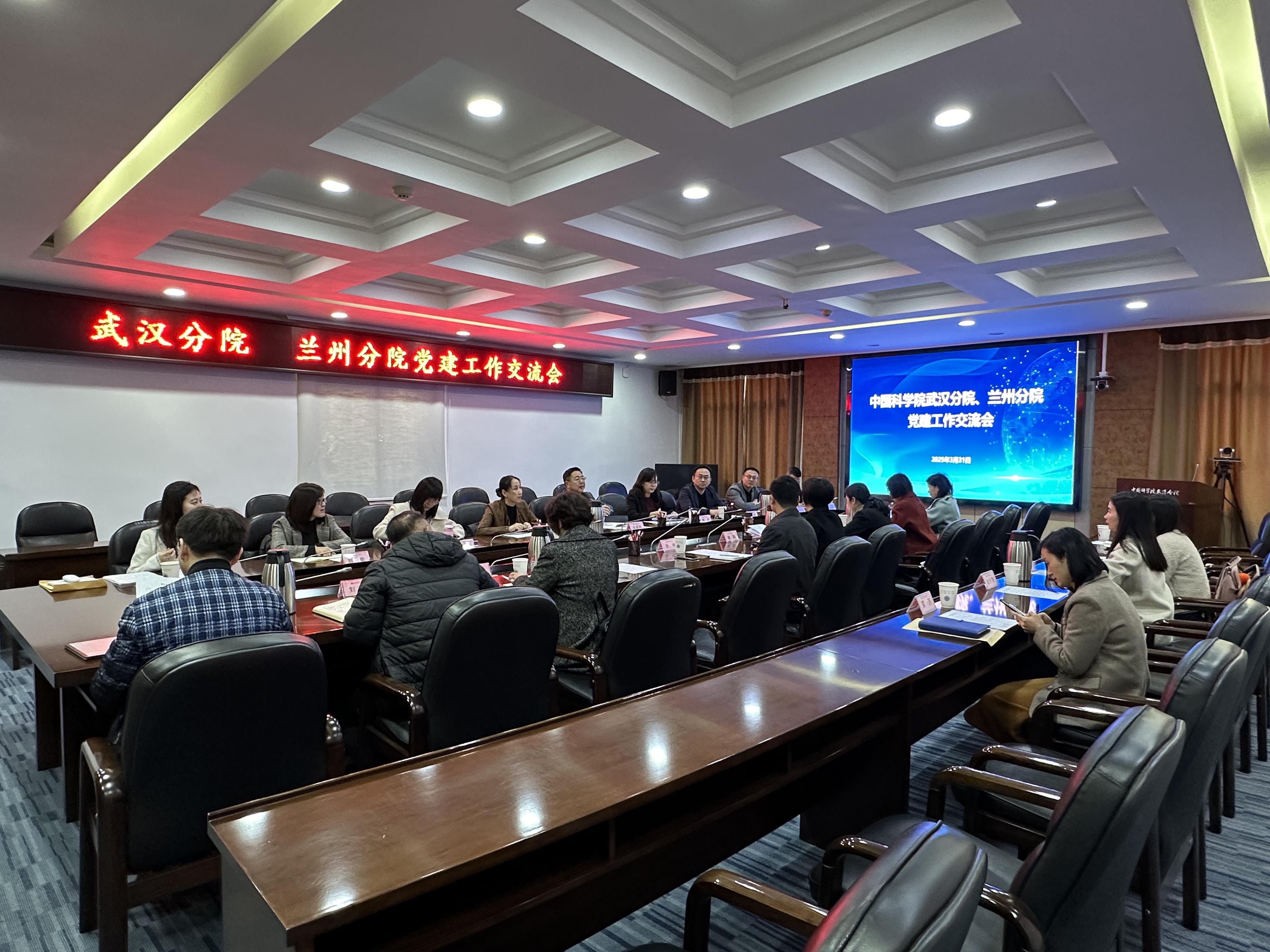 為促進(jìn)黨建工作經(jīng)驗互學(xué)互鑒,進(jìn)一步提升黨建工作質(zhì)量,3月31日至4月1日,中國科學(xué)院蘭州分院分黨組成員、紀(jì)檢組組長吳建剛帶領(lǐng)蘭州分院系統(tǒng)黨辦主任、黨務(wù)干部與武漢分院開展黨建工作調(diào)研交流。武漢分院、蘭州分院系統(tǒng)各單位黨辦主任及黨務(wù)干部20余人參加黨建工作交流會,會議由武漢分院分黨組副書記曾靜主持。