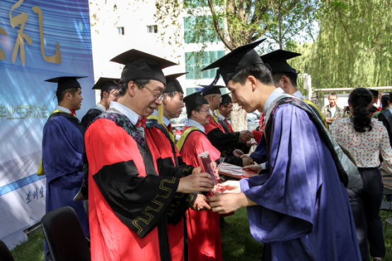 畢業(yè)典禮在雄壯的國歌聲中開始。趙紅衛(wèi)宣讀了《近代物理研究所關(guān)于準予杜俊杰等10名研究生畢業(yè)的決定》和《近代物理研究所關(guān)于準予蔡漢杰等61名研究生畢業(yè)的決定》。隨后,在高昂奮進的音樂中,趙紅衛(wèi)、袁平、夏佳文、馬新文和原有進為畢業(yè)生頒發(fā)畢業(yè)證書,肖國青為畢業(yè)生撥流蘇,并握手祝福。肖國青在致辭中向圓滿完成學業(yè)的全體畢業(yè)生表示熱烈的祝賀和美好的祝福,向為研究所教育事業(yè)辛勤付出的導師表示誠摯的感謝。他希望畢業(yè)生們無論身處何境,做什么工作,都要胸懷天下、心系國家,勤于實踐、勇于創(chuàng)新,直面艱難、勇于挑戰(zhàn),把實現(xiàn)個人價值融入到實現(xiàn)民族復興的偉大事業(yè)中去。在進入社會后要學會謙虛、誠懇待人,以樸實、嚴謹?shù)膽B(tài)度對待新的工作,樹立可信、可靠的良好形象。在困難面前做到不忘奮斗的初心,堅持對科學的信仰,堅持對真理的追求,堅守科研道德的底線,做一名與時俱進的優(yōu)秀人才。