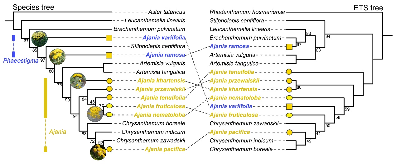 亞菊屬及其近緣類群系統(tǒng)發(fā)育不一致示意圖