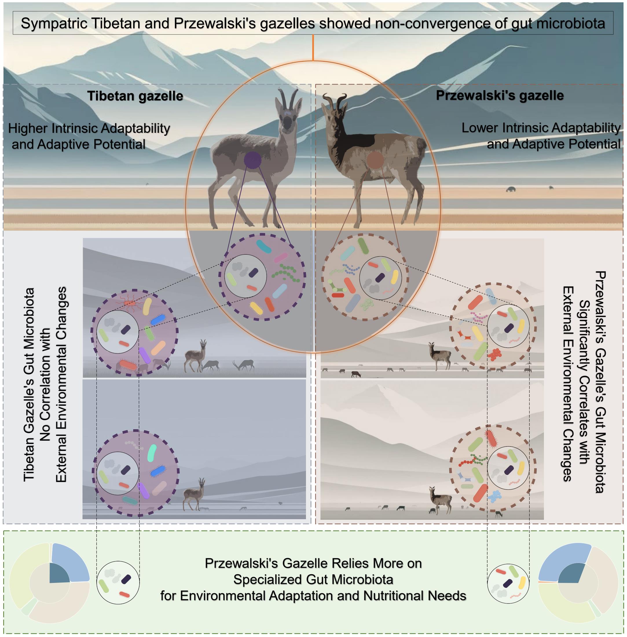 研究論文?Gut microbiota non-convergence and adaptations in sympatric Tibetan and Przewalski’s gazelles?發(fā)表在?Cell Press?旗下交叉學(xué)科期刊?iScience(中國科學(xué)院二區(qū))。西北高原所博士研究生宋鵬飛為第一作者,張同作研究員為通訊作者。該研究得到了國家自然科學(xué)基金區(qū)域創(chuàng)新發(fā)展聯(lián)合基金(U20A2012)等項(xiàng)目的支持。學(xué)科組依托中國科學(xué)院高原生物適應(yīng)與進(jìn)化重點(diǎn)實(shí)驗(yàn)室和青海省動(dòng)物生態(tài)基因組學(xué)重點(diǎn)實(shí)驗(yàn)室。
