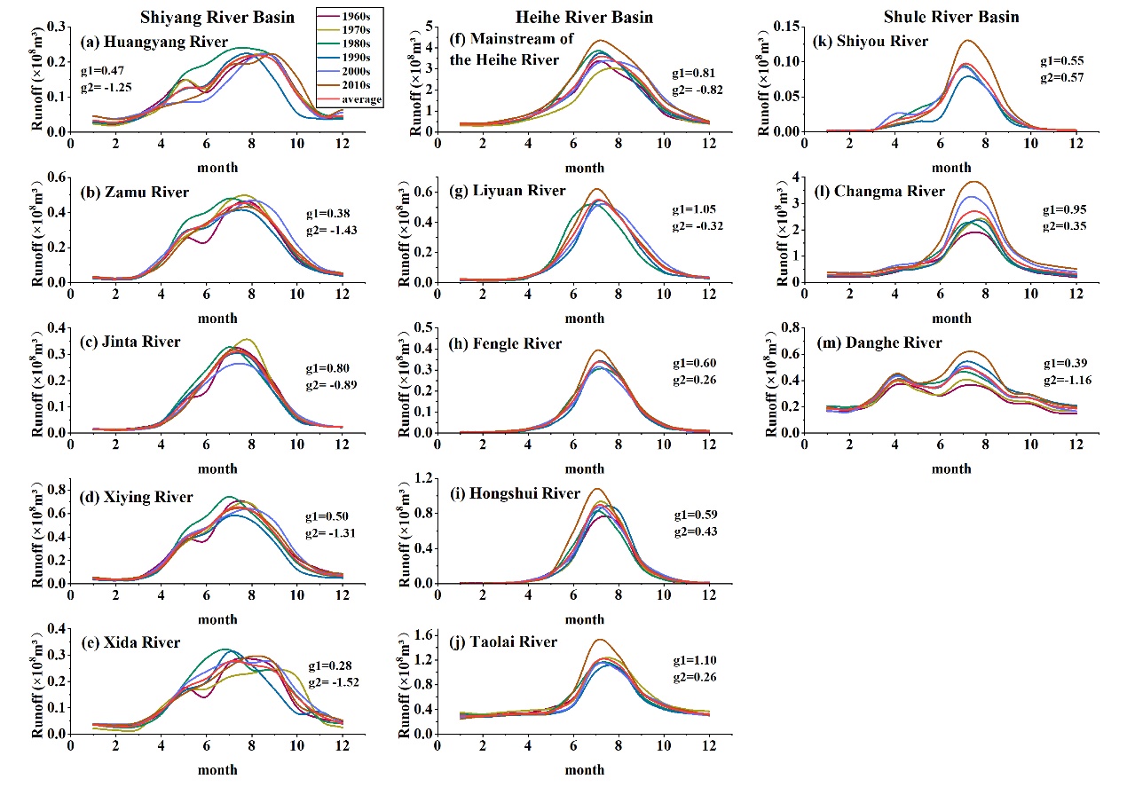 該成果以The changes in the annual distribution of mountain runoff during the period of 1965–2018 in Hexi Corridor,?northwest China為題發(fā)表于愛思唯爾旗下期刊Research in Cold and Arid Regions。