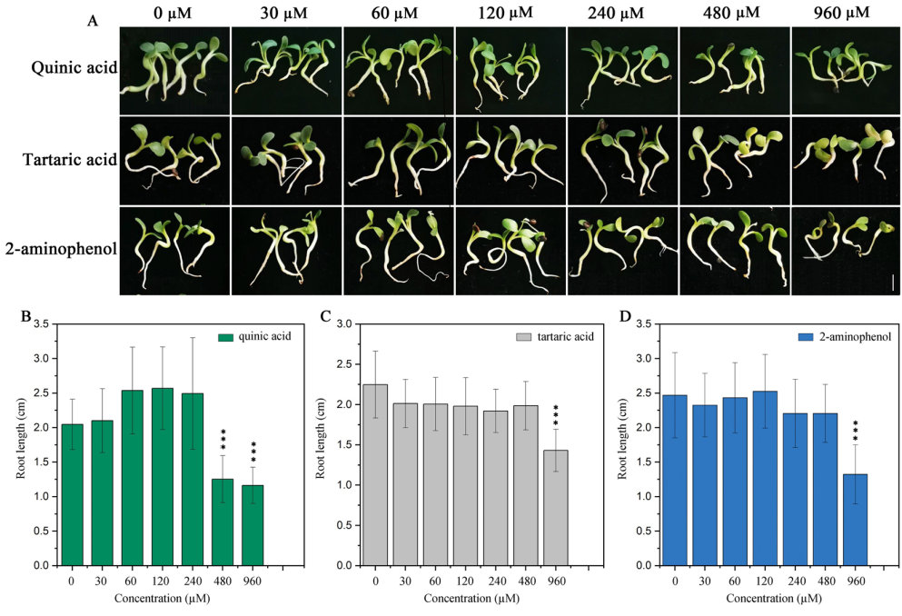 圖2:不同濃度2-氨基苯酚、奎尼酸或酒石酸處理10日齡蒙古黃芪幼苗的形態(tài)和根長(zhǎng)。