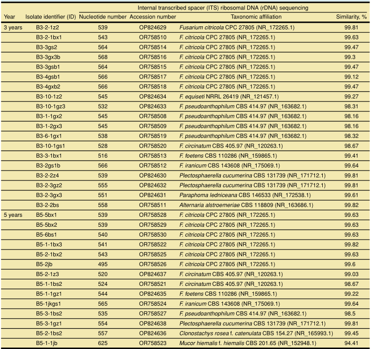 研究表明,黨參大田連作3年后,萎蔫和多種根腐病害頻發(fā);連作3年和5年土壤速效鉀含量和pH值顯著降低;與連作1年和2年相比,連作3年和5年的黨參根際土壤中真菌群落多樣性更高,并且一些屬水平的潛在致病性真菌分類(lèi)群的豐度明顯增加;在連作3年和5年的黨參根際,共分離到Fusarium species complexes等菌33株;且屬水平真菌群落豐度與速效磷、全氮和土壤有機(jī)質(zhì)呈顯著正相關(guān)。