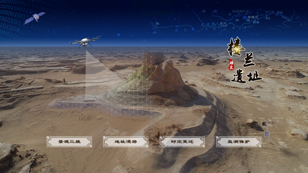 系統(tǒng)平臺通過“景觀三維、遺址漫游、時(shí)空變遷、監(jiān)測保護(hù)”四個(gè)功能模塊,實(shí)現(xiàn)了衛(wèi)星宏觀遙感、無人機(jī)精細(xì)測繪、地面實(shí)時(shí)監(jiān)測等綜合技術(shù)在樓蘭遺址的協(xié)同應(yīng)用。能夠通過精細(xì)二三維實(shí)景地圖模型客觀真實(shí)、身臨其境地展示遠(yuǎn)在千里之外的神秘古城;通過歷史地圖和衛(wèi)星遙感數(shù)據(jù)的空間一體化,提供了一套研究樓蘭古跡時(shí)空演變的空間數(shù)據(jù)庫;利用衛(wèi)星、無人機(jī)和地面?zhèn)鞲衅骷夹g(shù),實(shí)現(xiàn)了“天空地”一體化的樓蘭遺址生態(tài)環(huán)境因子系統(tǒng)監(jiān)測與分析。