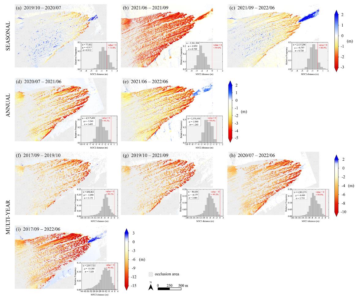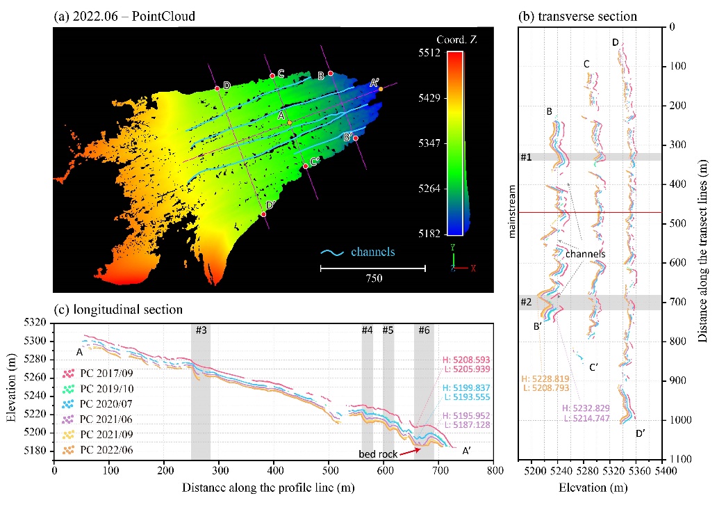 該研究通過運(yùn)用Multiscale Model to Model Cloud Comparison(M3C2)算法,以厘米級精度對崗隴加瑪冰川下游的變化進(jìn)行了全面刻畫。結(jié)合花桿觀測數(shù)據(jù)與降水記錄,研究團(tuán)隊(duì)成功重建了該冰川的物質(zhì)平衡序列。
