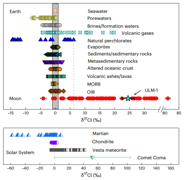 不同陸地和地外儲(chǔ)庫(kù)中氯同位素組成的成分