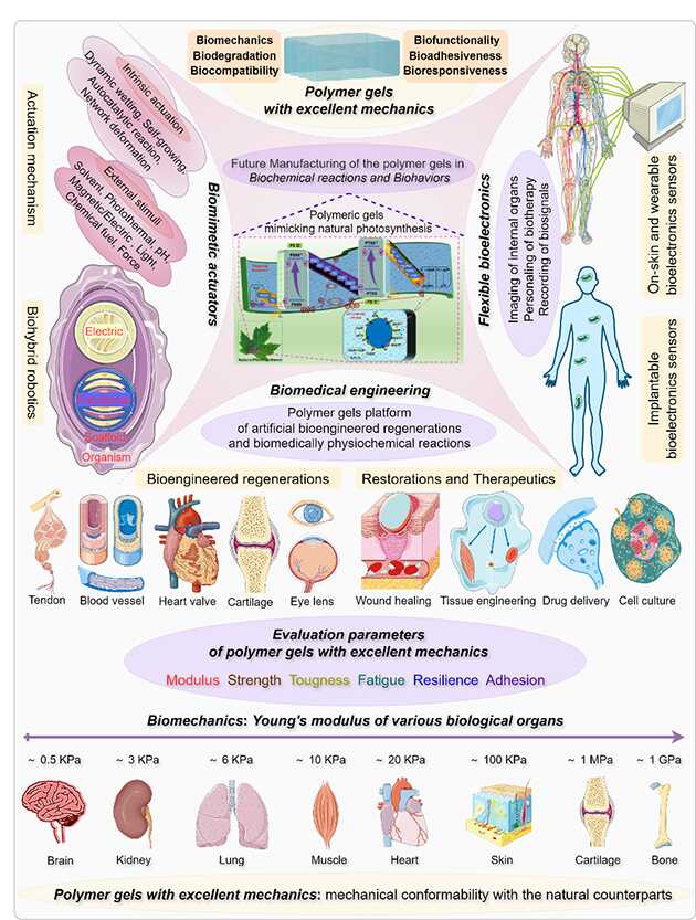圖1.?具有優(yōu)異力學(xué)性能聚合物凝膠的典型應(yīng)用和評(píng)價(jià)參數(shù)
