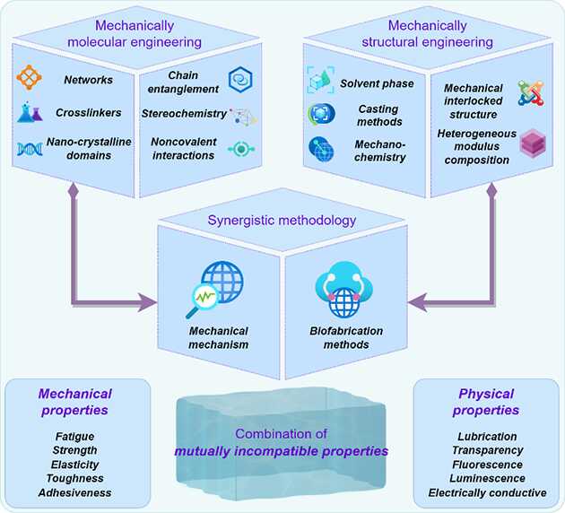 基于力學(xué)調(diào)控在分子工程和結(jié)構(gòu)工程的多種調(diào)控策略,研究發(fā)現(xiàn)分子和結(jié)構(gòu)尺度的耦合不僅會(huì)獲得極端力學(xué)性能,而且為物理和化學(xué)多種屬性之間的兼容提供了可操縱手段。作者融合凝膠材料的力學(xué)機(jī)制和仿生制造方法,提出了“協(xié)同方法學(xué)”(synergistic methodology)的調(diào)控思想。在力學(xué)性能方面,協(xié)同方法學(xué)主要是指將分子工程和結(jié)構(gòu)工程的各種調(diào)控策略完美地集成在同一體材料中,實(shí)現(xiàn)不同力學(xué)屬性之間的權(quán)衡,尤其在強(qiáng)度、韌性、彈性、疲勞、黏附等;在凝膠功能方面,協(xié)同方法學(xué)主要指實(shí)現(xiàn)力學(xué)性質(zhì)與電學(xué)、光學(xué)、生物摩擦學(xué)等性質(zhì)之間的兼容。聚合物凝膠構(gòu)筑協(xié)同方法學(xué)從材料性能和功能兩個(gè)調(diào)控視角出發(fā),為解決材料互不相容性質(zhì)之間的沖突提供了新思路,對(duì)設(shè)計(jì)制備具有優(yōu)異性能與特殊功能的新型聚合物凝膠材料具有重要的參考價(jià)值和理論指導(dǎo)作用。