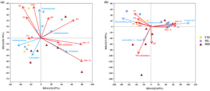 高通量測序分析表明,塑料圈中的α多樣性(Chao1和香農(nóng)指數(shù))低于土壤中的α多樣性,且隨土壤中微塑料豐度的變化而顯著不同。隨著微塑料豐度的增加,土壤中有機質(zhì)降解類群和光自養(yǎng)類群的比例也隨之增加,并顯示在塑料圈中富集。功能預(yù)測進一步表明,微塑料的豐度影響了土壤的潛在功能,如與碳和氮循環(huán)相關(guān)的代謝途徑。與土壤環(huán)境相比,塑料圈中與有機物降解相關(guān)的功能豐度較高,且塑料圈的潛在健康風(fēng)險更高。根據(jù)冗余(RDA)分析,可以確定環(huán)境理化性質(zhì)和微塑料豐度對真菌群落的影響大于對細菌群落的影響(圖3)。這表明,微塑料豐度會影響微生物多樣性組成,并可能影響土壤生態(tài)系統(tǒng)的整體性能。