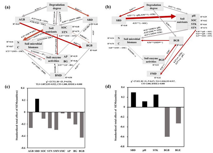 三江源高寒草甸土壤細菌多樣性(a, c)和真菌多樣性(b, d)的結(jié)構(gòu)方程模型