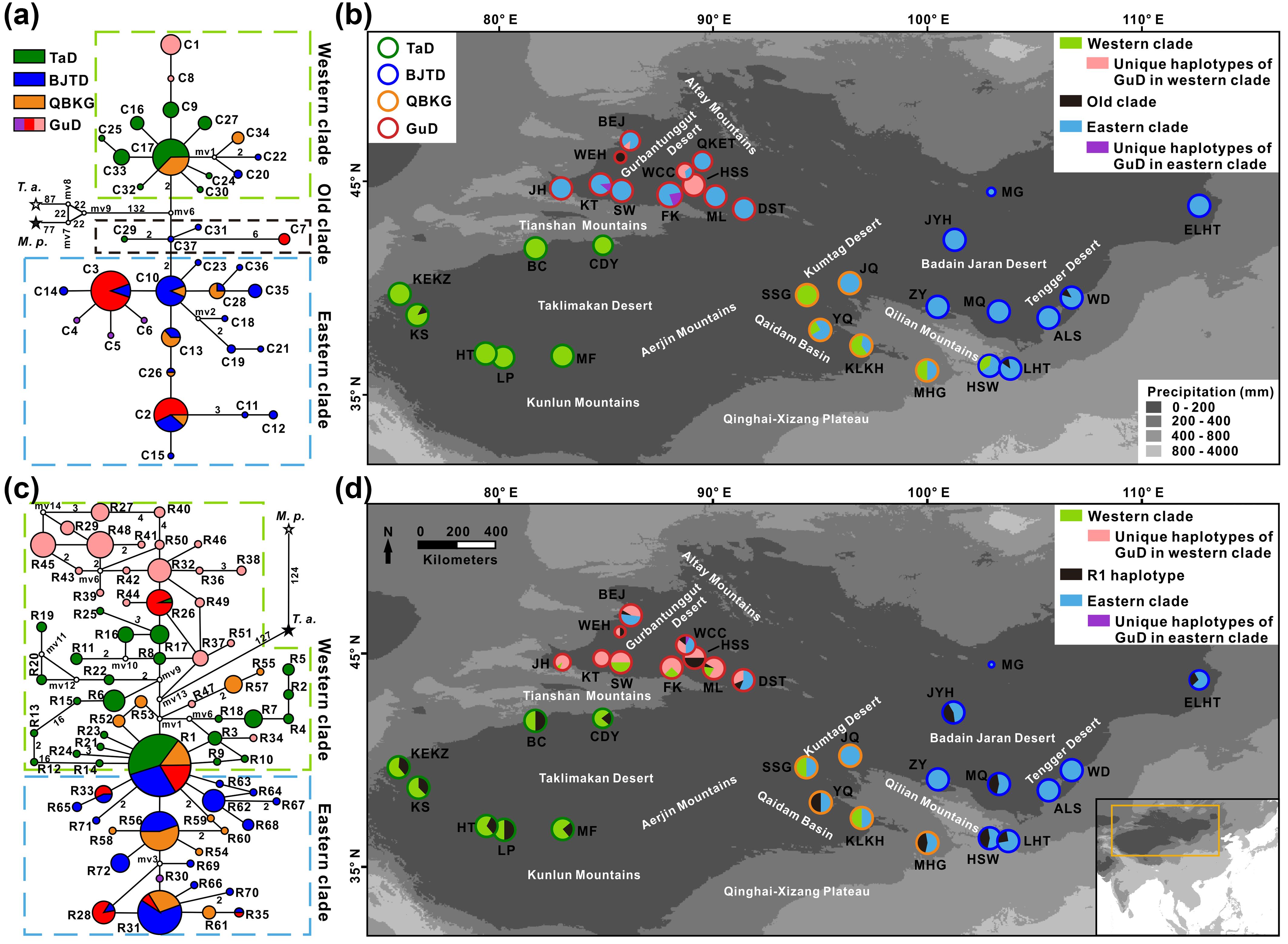 為了進(jìn)一步闡明紅砂不同支系的形成歷史,厘清雜交物種形成在北疆紅砂生物多樣性形成中的作用,中國科學(xué)院西北生態(tài)環(huán)境資源研究院馬小飛課題組采集了紅砂物種范圍的32個群體,通過分析并比對母系遺傳的cpDNA序列和雙親遺傳的nrITS序列在群體間的遺傳變異模式,重新深入解析了紅砂的譜系地理結(jié)構(gòu)及其時空演化歷史。