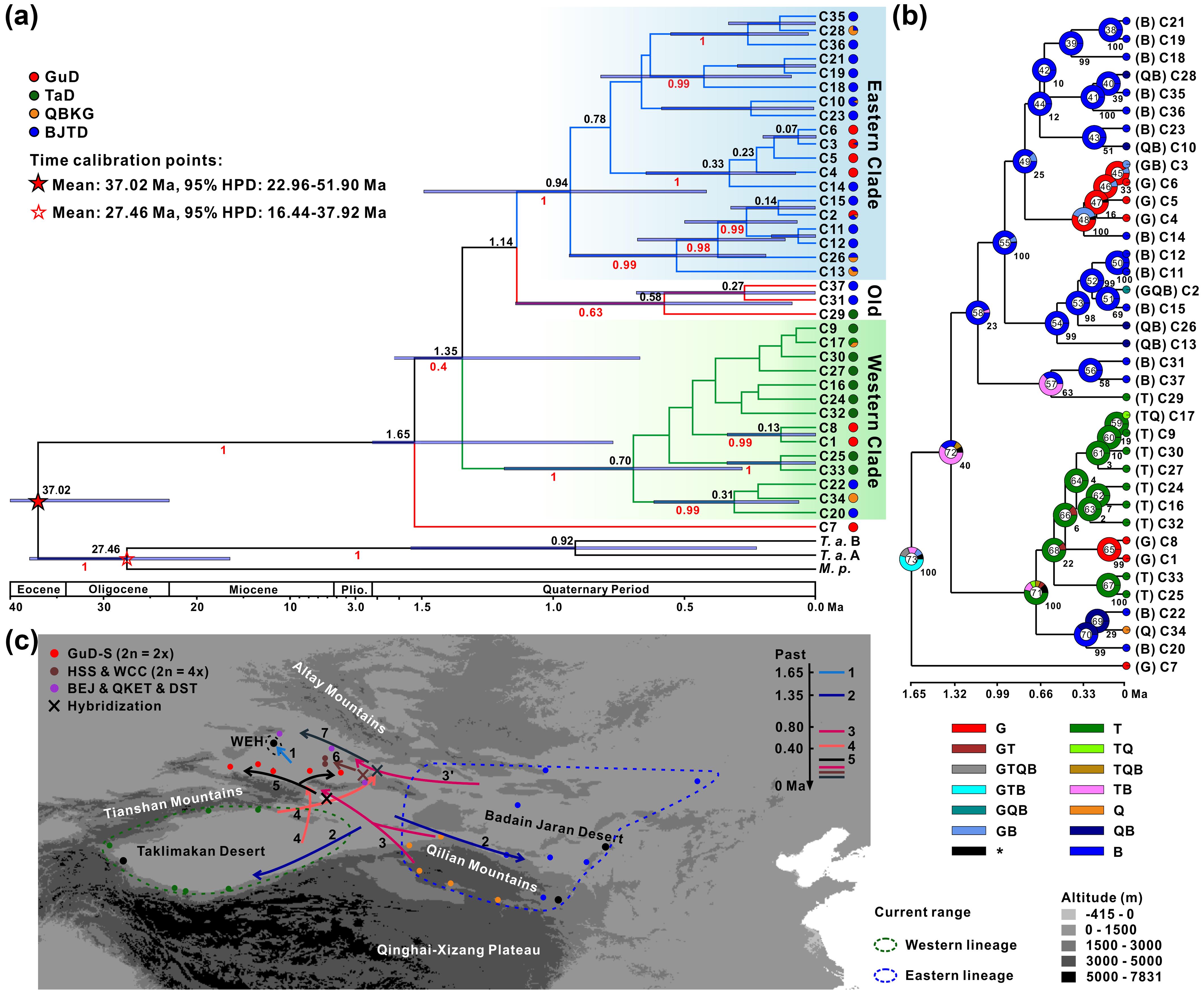 除烏爾禾群體以外,GuD-S和GuD-N的起源時間均晚于0.5百萬年前,推測第四紀(jì)氣候震蕩和昆侖-黃河運(yùn)動導(dǎo)致的古爾班通古特沙漠多次收縮和擴(kuò)張,為親本支系之間或雜交后代與親本支系之間的二次接觸提供了機(jī)會,是北疆紅砂種內(nèi)多樣性發(fā)生的主要原因,這為認(rèn)識準(zhǔn)噶爾盆地植物區(qū)系的復(fù)雜起源以及雜交在物種多樣性中的作用提供了一個范例。