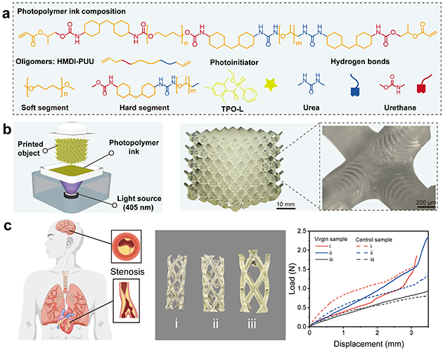 研究人員通過在聚氨酯前驅(qū)體中引入了脲基和酯基,發(fā)展了多重氫鍵誘導(dǎo)的可快速光固化3D打印的超分子聚氨酯彈性體,獲得的彈性體具有優(yōu)異的高彈性、高強(qiáng)度、韌性以及良好的生物相容性和血液相容性。具有高精度光固化3D打印性能的聚氨酯彈性體綜合了高性能與快速結(jié)構(gòu)制造方面的優(yōu)勢(shì),為具有優(yōu)異抗壓縮承載能力和機(jī)械穩(wěn)定性等特性的復(fù)雜柔性結(jié)構(gòu)生物醫(yī)療器械的制造提供了新的材料技術(shù)方案。