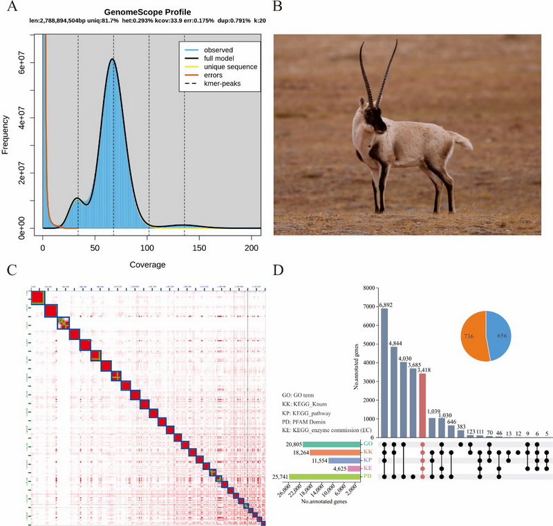 中國科學(xué)院西北高原生物研究所動(dòng)物生態(tài)與資源保護(hù)研究團(tuán)隊(duì)聯(lián)合青海大學(xué),基于PacBio HiFi三代基因組測序、Hi-C測序和DNBSEQ-T7二代基因組survey測序三種測序技術(shù),成功組裝了藏羚染色體級(jí)別的基因組。結(jié)果顯示,藏羚基因組大小為3.1 Gb,Contig N50為84.6 Mb,所有基因掛載到30條染色體上(29 + X),與之前的核型研究一致。數(shù)據(jù)評(píng)估顯示,藏羚基因組BUSCO得分為98.2%(S:92.3%,D:5.9%,F(xiàn):0.8%,M:1.0%),平均QV值為70.14,表明組裝的連續(xù)性好,完整度和準(zhǔn)確性高。基于EDTA和RepeatModeler從頭預(yù)測的藏羚基因組中重復(fù)序列注釋結(jié)果表明,藏羚基因組重復(fù)序列主要由SINEs、LINEs、LTRs 和DNA transposons四種類型組成,序列總長度為1.65 Gb,占基因組的52.47%;基于蛋白同源預(yù)測、蛋白從頭預(yù)測和深度學(xué)習(xí)等多種策略,在藏羚基因組上共注釋到28,330個(gè)功能基因。綜上,通過多種技術(shù)手段,首次獲得了藏羚染色體水平的高質(zhì)量基因組和注釋信息,為藏羚的適應(yīng)進(jìn)化遺傳機(jī)制、保護(hù)遺傳學(xué)研究及進(jìn)一步探索物種遷徙行為的遺傳機(jī)制提供了重要的基因組資源。
