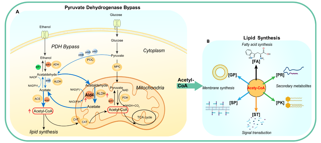 基于此現(xiàn)狀,科研人員利用蘭州重離子加速器(HIRFL)對目標(biāo)突變體實(shí)施多輪輻射,結(jié)合ALE技術(shù)提高了酵母的抗逆性和耐受性,因此獲得了適應(yīng)性更強(qiáng)的底盤細(xì)胞。再通過多組學(xué)聯(lián)合分析方法識別出與其發(fā)酵性能相關(guān)的重要基因,利用基因編輯技術(shù)對代謝通路進(jìn)行精準(zhǔn)優(yōu)化,著重優(yōu)化了核心代謝中間產(chǎn)物的代謝通量,使乙酰輔酶A水平較之前提高了17.10%,從而顯著提高了酵母在合成脂類和其他高附加值化合物方面的產(chǎn)量。