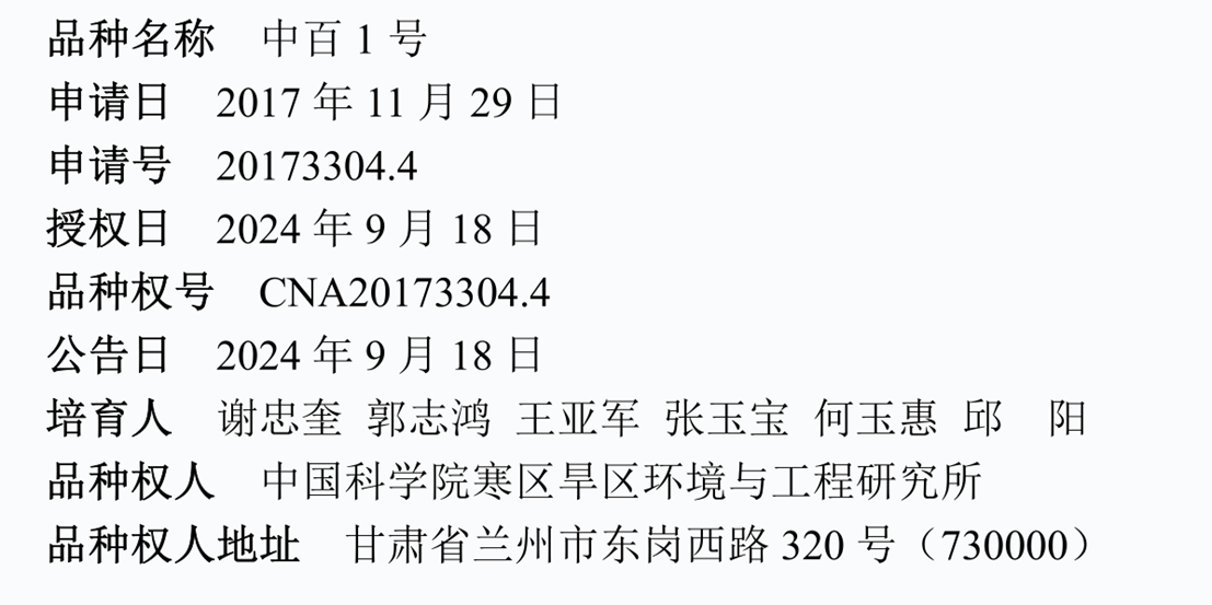 近日,中國科學(xué)院西北生態(tài)環(huán)境資源研究院蘭州生態(tài)農(nóng)業(yè)試驗(yàn)研究站(簡稱“蘭州農(nóng)業(yè)站”)謝忠奎研究員團(tuán)隊(duì)自主選育的“中百1號(hào)”蘭州百合新品種上榜農(nóng)業(yè)農(nóng)村部2024年第826號(hào)授予植物新品種權(quán)名單。這是我國首個(gè)被授予植物新品種權(quán)的優(yōu)質(zhì)高產(chǎn)食用百合品種,同時(shí)也是西北研究院首次獲植物品種權(quán)授權(quán)。