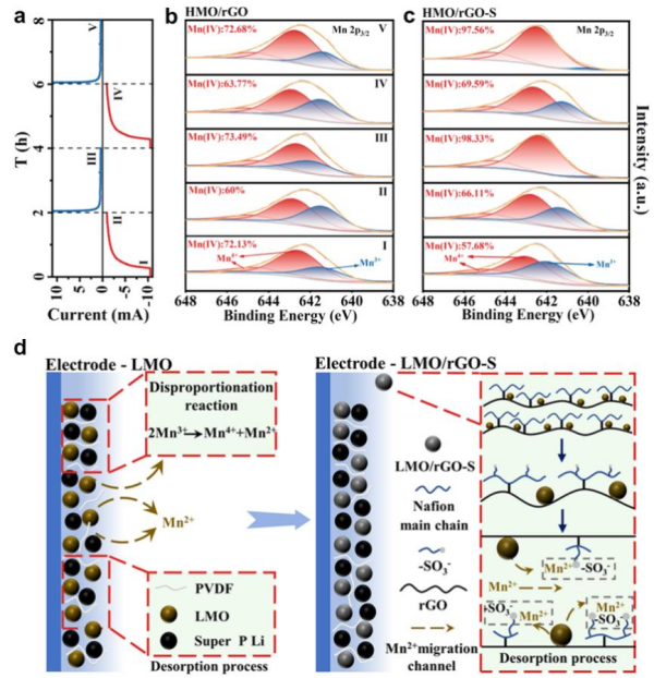 除離子傳輸效率外,針對(duì)錳基電活性材料因電極極化導(dǎo)致的穩(wěn)定性較差的問(wèn)題,采用還原氧化石墨烯(rGO)與Nafion協(xié)同改性的策略制備得到高效穩(wěn)定電化學(xué)吸附材料。rGO在增加材料分散性的同時(shí)大幅降低了材料極化,緩解極化過(guò)程帶來(lái)的容量衰減,使得吸附容量和循環(huán)穩(wěn)定性得到提升。研究表明Nafion通過(guò)主鏈與還原氧化石墨烯表面羧基結(jié)合,而支鏈磺酸基團(tuán)(-SO3-)可以捕獲因歧化反應(yīng)溶出的Mn2+,從而使得材料表面局部Mn2+濃度升高(圖2)。經(jīng)過(guò)協(xié)同改性,材料30次循環(huán)容量保持率由79.04%提升至94.64%。該研究驗(yàn)證了離子捕獲機(jī)制抑制歧化反應(yīng)的可行性,能夠?yàn)殄i系材料在電化學(xué)分離過(guò)程中的溶損問(wèn)題提供新的解決思路(Chem. Eng. J,497?。?024) 155009)。