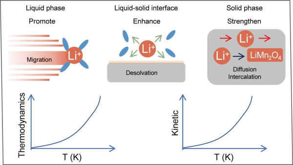 在材料改性的基礎(chǔ)上,青海鹽湖研究所科研人員針對(duì)環(huán)境溫度影響電化學(xué)吸附熱力學(xué)和動(dòng)力學(xué)研究不夠深入的問(wèn)題,開(kāi)展了逐步升溫的策略(273.15到328.15 K),探究了溫度如何影響液相中水合離子遷移,固液界面離子脫水合和電子轉(zhuǎn)移,固相中離子擴(kuò)散等行為的熱力學(xué)和動(dòng)力學(xué)(圖3)。該研究通過(guò)升溫強(qiáng)化了熱力學(xué)和動(dòng)力學(xué),使吸附速率和吸附容量改善,且通過(guò)調(diào)節(jié)反應(yīng)參數(shù)優(yōu)化反應(yīng)速率的策略也可用于電池、催化合能源等領(lǐng)域(Sep. Purif. Technol.355?。?025) 129631)。