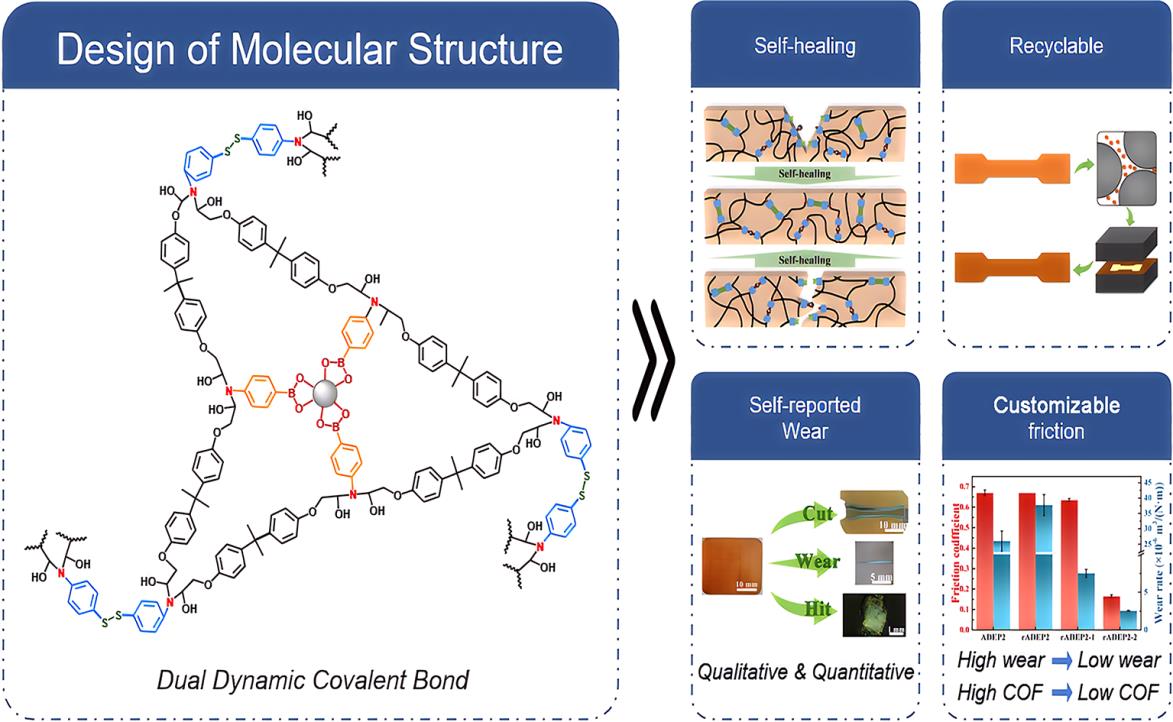 圖2.基于雙動(dòng)態(tài)共價(jià)交聯(lián)的多功能聚合物設(shè)計(jì),包括自愈合、可回收、自報(bào)告磨損和可定制摩擦性能。