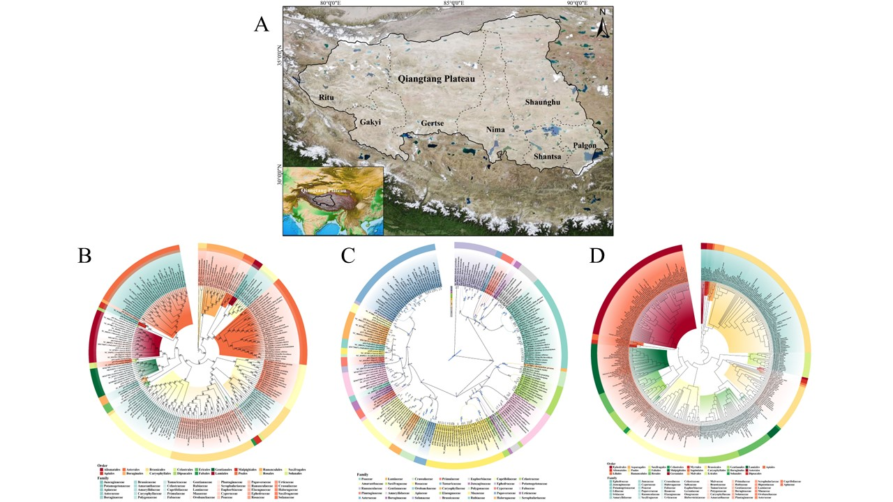 系統(tǒng)發(fā)育區(qū)系學(xué)通過將系統(tǒng)發(fā)育信息整合到植物區(qū)系分析中,推斷區(qū)系內(nèi)物種的分化時(shí)間,從而更好地反映不同區(qū)域物種分布及組合的動(dòng)態(tài)歷史過程,揭示區(qū)系的起源及演化歷史。羌塘高原位于青藏高原腹地,是“世界屋脊的屋脊”,因其獨(dú)特且完整的高寒生態(tài)系統(tǒng)以及眾多珍稀瀕危物種成為研究青藏高原乃至世界高寒干旱植物區(qū)系起源及演化歷史的天然實(shí)驗(yàn)室。本研究基于傳統(tǒng)植物區(qū)系學(xué)和系統(tǒng)發(fā)育區(qū)系學(xué)的方法,對(duì)羌塘高原種子植物開展區(qū)系研究,重建了370種植物的系統(tǒng)發(fā)育關(guān)系,對(duì)研究區(qū)內(nèi)各縣域網(wǎng)格單元進(jìn)行系統(tǒng)發(fā)育多樣性分析,并結(jié)合平均分化時(shí)間和物種分歧時(shí)間,探討羌塘高原植物多樣性格局及其形成機(jī)制。