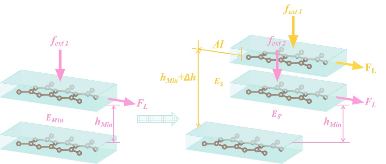 圖2 等載和等距滑動過程中界面受力示意圖?;瑒舆^程中的能量最小點(左)和鞍點(右)。黃色和粉色標記分別表示等載和等距滑動過程的界面信息