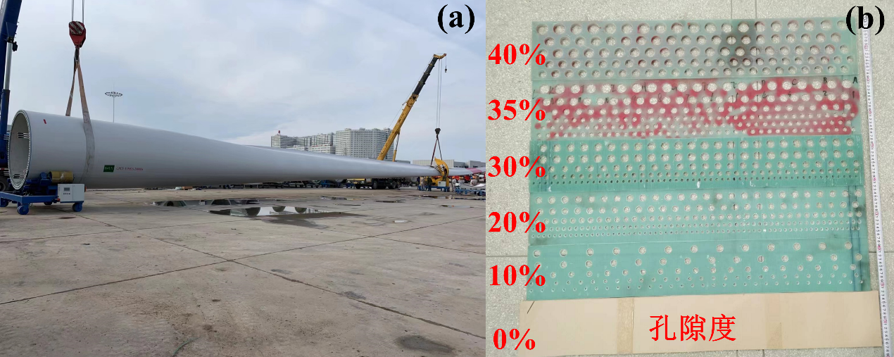 退役或損壞風力發(fā)電機葉片(a)和不同孔隙度新型多孔沙障(b)