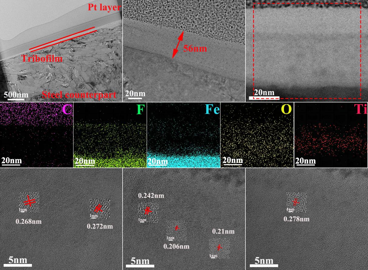 近期,針對(duì)纖維織物自潤(rùn)滑復(fù)合材料摩擦學(xué)性能協(xié)同優(yōu)化的技術(shù)難題,研究團(tuán)隊(duì)基于前期研究基礎(chǔ),制備了具有核殼結(jié)構(gòu)的Ti3C2/SA/TiO2-MePCM相變微膠囊。該微膠囊以機(jī)械強(qiáng)度優(yōu)異的二氧化鈦為殼層增強(qiáng)復(fù)合材料力學(xué)性能,內(nèi)核正二十二烷通過(guò)相變作用吸收摩擦熱并實(shí)現(xiàn)局部固-液協(xié)同潤(rùn)滑,同時(shí)二維材料Ti3C2Tx憑借其層間滑移特性和高承載能力有效降低復(fù)合材料的摩擦損傷。實(shí)驗(yàn)數(shù)據(jù)表明,引入該微膠囊后纖維織物自潤(rùn)滑復(fù)合材料的摩擦系數(shù)由0.053降至0.046,磨損率由8.9×10-14m3 (N·m)-1顯著降低至3.5×10-14m3(N·m)-1。研究團(tuán)隊(duì)通過(guò)多種表征技術(shù)系統(tǒng)解析了摩擦膜的微觀形貌演變規(guī)律,闡明了織物復(fù)合材料的減摩抗磨作用機(jī)制,為核殼結(jié)構(gòu)材料在摩擦學(xué)領(lǐng)域的創(chuàng)新應(yīng)用提供了理論支撐。