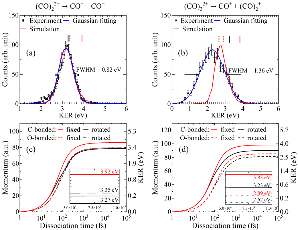 為了解釋這一實驗現(xiàn)象,科研人員在傳統(tǒng)的點電荷模型基礎(chǔ)上,引入了更高階的電荷分布模型,并特別考慮了CO+的電荷分布和電偶極矩。結(jié)果表明,偶極作用誘導(dǎo)了CO?碎片的轉(zhuǎn)動激發(fā)。這種能量傳遞機(jī)制充分解釋了實驗與理論之間的差異,同時揭示了庫倫爆炸過程偶極相互作用誘導(dǎo)的CO?碎化。