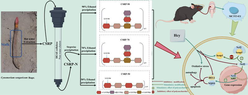 為了解決鎖陽資源利用中存在的上述科學(xué)問題,中國(guó)科學(xué)院西北高原生物研究所青海省藏藥藥理學(xué)和安全性評(píng)價(jià)研究重點(diǎn)實(shí)驗(yàn)室團(tuán)隊(duì),采用熱水提取、乙醇沉淀分級(jí)及柱層析純化相結(jié)合的方法,從鎖陽中得到3個(gè)多糖組分:CSRP-50、CSRP-70和CSRP-90,隨后對(duì)其組成、結(jié)構(gòu)、Hcy誘導(dǎo)成骨細(xì)胞氧化損傷保護(hù)作用進(jìn)行研究。組成結(jié)構(gòu)研究結(jié)果表明,3個(gè)多糖組分均為天然甲基化的α-(1→4),(1→6)-D-葡聚糖,其主鏈由α-1,4-D-Glcp和α-1,6-D-Glcp交替構(gòu)成。其中,CSRP-50無支鏈結(jié)構(gòu),CSRP-70和CSRP-90存在由α-1,6-D-Glcp和末端1位連接的α(β)-D-Glcp構(gòu)成的支鏈,該支鏈結(jié)構(gòu)連接在主鏈α-1,4-D-Glcp的O-6位。藥理活性研究結(jié)果表明,CSRP-50、CSRP-70和CSRP-90均可通過激活Keap1/Nrf2信號(hào)通路,增強(qiáng)成骨細(xì)胞抗氧化能力,進(jìn)而保護(hù)成骨細(xì)胞對(duì)抗Hcy誘導(dǎo)的氧化應(yīng)激損傷,表現(xiàn)出很好的抗骨質(zhì)疏松作用潛力。該研究為鎖陽及其多糖成分在抗骨質(zhì)疏松癥方面的進(jìn)一步研究與利用提供科學(xué)依據(jù)。