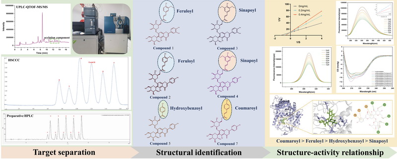 中國科學(xué)院西北高原生物研究所高原藏藥資源質(zhì)控與藥理毒理評(píng)價(jià)研究團(tuán)隊(duì)通過建立UPLC-QTOF-MS/MS結(jié)合高速逆流色譜和制備液相色譜的靶向分離技術(shù),成功從青稞苗中分離得到6個(gè)以大麥黃苷和皂草黃苷為母核的不同?;揎椀难苌?。通過多維度的分子相互作用研究發(fā)現(xiàn),大麥黃苷和皂草黃苷?;?,其α-葡萄糖苷酶抑制活性均明顯提高,表現(xiàn)為香豆?;?gt;阿魏?;?gt;對(duì)羥基苯甲?;?gt;芥子酰基。6個(gè)酰化黃酮與α-葡萄糖苷酶均具有較高的結(jié)合常數(shù),主要通過范德華力和氫鍵作用占據(jù)α-葡萄糖苷酶的活性位點(diǎn)并形成穩(wěn)定的復(fù)合物,并改變關(guān)鍵氨基酸殘基和二級(jí)結(jié)構(gòu),從而降低酶催化活性。該研究為復(fù)雜天然產(chǎn)物的靶向分離純化以及?;S酮與α-葡萄糖苷酶抑制活性之間的構(gòu)效關(guān)系的研究提供了新的思路。