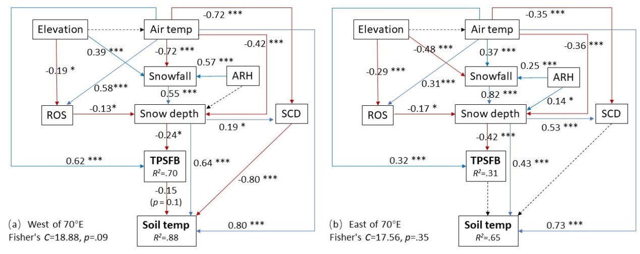 近日,中國(guó)科學(xué)院西北生態(tài)環(huán)境資源研究院聯(lián)合美國(guó)猶他大學(xué)、中山大學(xué)以及中國(guó)科學(xué)院、水利部成都山地災(zāi)害與環(huán)境研究所,基于1966至2019年歐亞大陸北部氣象站點(diǎn)數(shù)據(jù),對(duì)冷季總無(wú)雪間歇期(TPSFB)進(jìn)行了分析,并利用結(jié)構(gòu)方程模型評(píng)估了氣象、積雪條件和 TPSFB對(duì)土壤熱狀況的潛在綜合影響。