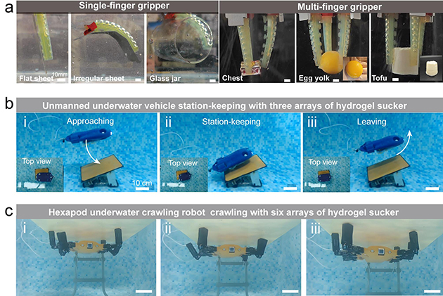 為進(jìn)一步凸顯非破壞性粘附的實(shí)用性,研究人員研制了一款采用液壓驅(qū)動(dòng)、配備仿生吸盤(pán)的水凝膠夾持器,可自適應(yīng)地操縱各種水下物體,不僅能應(yīng)對(duì)曲面復(fù)雜的物體,甚至還能溫和處理蛋黃、豆腐塊等極為脆弱的食品。 此外,研究人員將這類(lèi)水凝膠吸盤(pán)陣列結(jié)構(gòu)集成到水下無(wú)人航行器的腹部和六足機(jī)器人的足端,從而賦予其水下操控物體、定點(diǎn)停留及表面爬行等特殊功能,為復(fù)雜海洋環(huán)境場(chǎng)景中的應(yīng)用提供了高適形、可逆、低損的粘附手段。