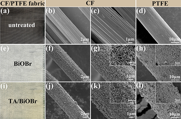 眾所周知,CF和PTFE纖維表面具有強化學惰性,導(dǎo)致其復(fù)合材料的界面結(jié)合性能差。在上述工作進行摩擦學性能評價的過程中,存在大量纖維與樹脂基體脫黏拔出的現(xiàn)象,對復(fù)合材料的整體性能的發(fā)揮產(chǎn)生不利影響。近日,研究團隊基于前期研究基礎(chǔ),在界面優(yōu)化改性方面提出了新思路。團隊首次將BiOBr應(yīng)用于摩擦學領(lǐng)域,并提出了“軟-硬-軟”多級結(jié)構(gòu)的設(shè)計思路,通過化學浴、水熱生長和層層自組裝方法在CF/PTFE織物表面依次構(gòu)建了化學交聯(lián)的“軟”基底層(PEI/PA)、垂直取向的“硬”中間層(BiOBr納米片)以及動態(tài)配位的“軟”外層(TA/Fe3+金屬-多酚網(wǎng)絡(luò))。其改性前后的纖維表面形貌如圖1所示。