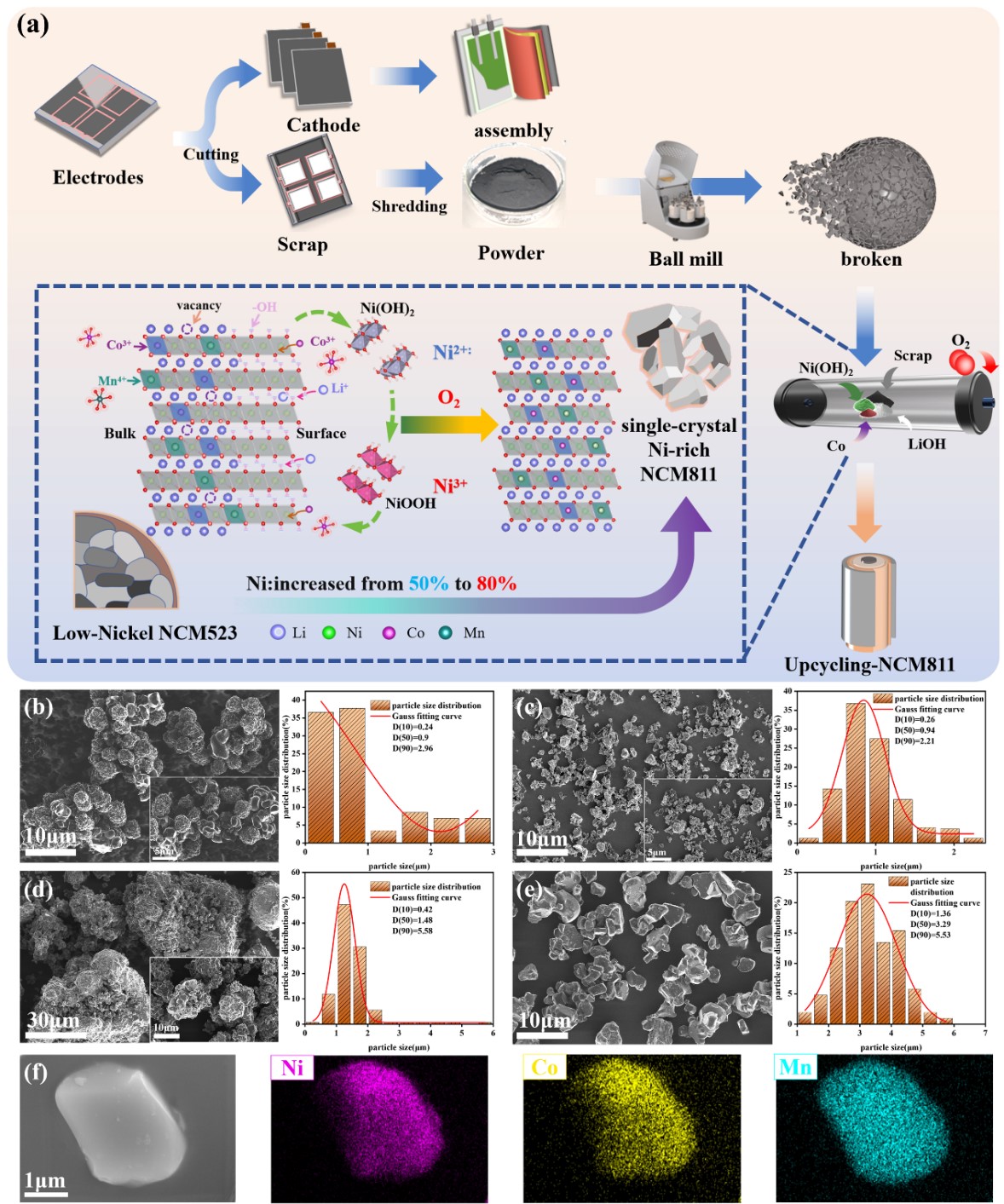 近日,中國科學院青海鹽湖研究所相變儲能課題組李翔副研究員提出一種針對低鎳、異質三元正極混合廢料(如NCM523)的修復再生技術,成功將其轉化為鎳梯度分布的單晶NCM811正極材料,實現(xiàn)了廢料的高值化利用與性能超越。該研究系統(tǒng)揭示了三元正極混合廢料在修復再生過程中的動態(tài)重構路徑。研究發(fā)現(xiàn),由于混合廢料中不同尺寸顆粒在空氣中存儲時失效程度存在顯著差異,尤其是小粒徑顆粒更易受到空氣侵蝕,造成更深層次的晶格鋰損失和鹽巖相變,這為直接再生帶來巨大挑戰(zhàn)。團隊創(chuàng)新性地采用“簡單機械球磨+雙過渡金屬補償”相結合的策略,無需嚴苛條件與原料均一性要求,即可將來源多樣、粒徑不一的NCM523混合廢料,修復再生為富鎳單晶NCM811正極材料。研究結果表明,該再生單晶NCM811材料展現(xiàn)出卓越的電化學性能:在0.1C倍率下比容量高達202 mAh/g;在1C倍率下循環(huán)200次后容量保持率達到80.7%,剩余容量超過145 mAh/g;即便在5C高倍率下循環(huán)200次,容量保持率仍保持在79.4%以上,其倍率性能與循環(huán)穩(wěn)定性優(yōu)于市售商用單晶NCM811材料。同時,該材料有效抑制了H?→H?相變,進一步提升了材料結構穩(wěn)定性和電池安全性。