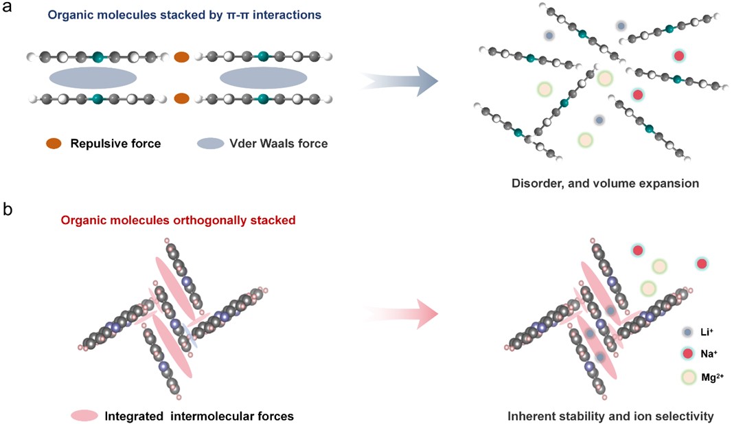 針對高容量有機小分子電極因離子插層體積膨脹導致結構坍塌失穩(wěn)的科學挑戰(zhàn),研究團隊開創(chuàng)性地提出基于分子間作用力網(wǎng)絡構筑穩(wěn)定晶體結構的新思路。以吩嗪為模型體系,研究證實正交垂直的分子堆疊方式可形成強分子間作用力網(wǎng)絡和具有離子選擇性的納米孔道。該結構不僅能有效抑制體積膨脹帶來的機械失效問題,同時其產(chǎn)生的親鋰孔道在原子尺度對單價金屬離子(Li)具有優(yōu)先傳輸與選擇性性能,選擇性提鋰容量高達109 mg/g。該工作原創(chuàng)性地揭示了分子堆疊微結構與電極材料的宏觀電化學穩(wěn)定性和離子選擇性之間的內(nèi)在物理化學規(guī)律,為設計新一代兼具高穩(wěn)定性、高選擇性、高通量的有機電化學離子捕獲材料奠定了重要理論基礎。