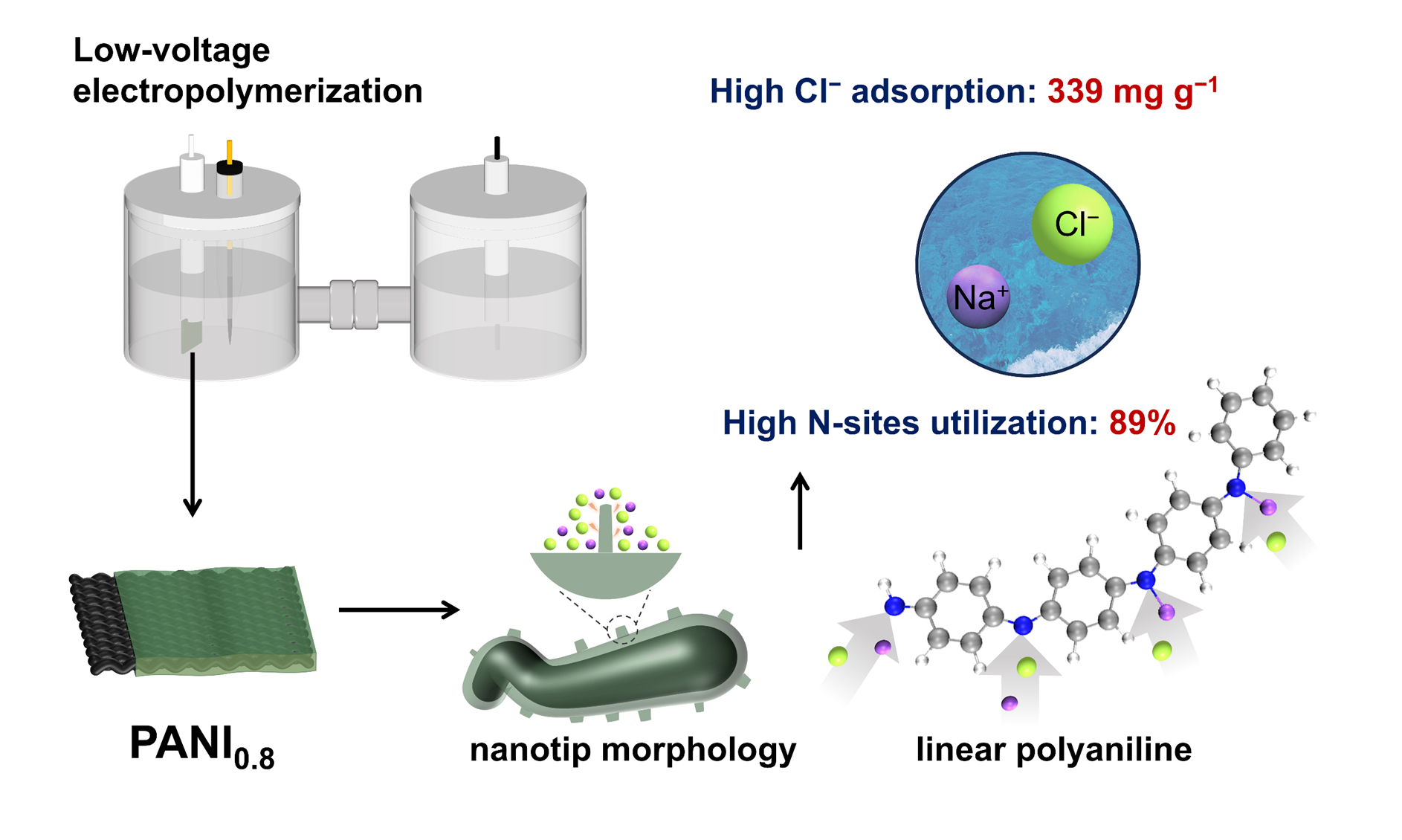在鹵水資源電化學提取過程中,需兼顧電中性原則,因此高效提取伴生陰離子同樣重要。聚苯胺(PANI)憑借優(yōu)異的導電性和可逆摻雜特性,廣泛應用于能源存儲、環(huán)境凈化和離子分離等領域。然而,傳統(tǒng)PANI因氮活性位點利用率低、微宏觀構效關系不明確等問題,限制了其在高性能電化學脫鹽中的應用。研究團隊創(chuàng)造性發(fā)現(xiàn)聚合電位是調控其微觀結構(如聚合度、鏈結構、缺陷類型)的關鍵參數(shù)。通過原位電化學光譜等手段論證,采用“低電位”策略可有效抑制偶聯(lián)副反應,制備出含納米尖端的低聚度線性結構聚苯胺。該獨特結構顯著提升了含氮位點的暴露效率和可接近性:實現(xiàn)突破性高容量氯離子吸附(Cl容量達339 mg/g)和鈉離子吸附(142 mg/g)。該工作顯著推動了結構可控聚合物的設計及其在電化學分離中的應用。