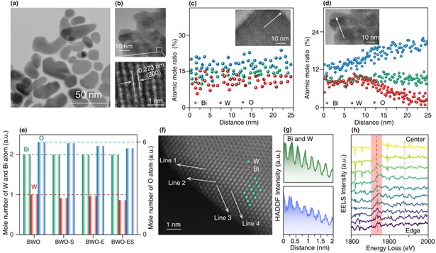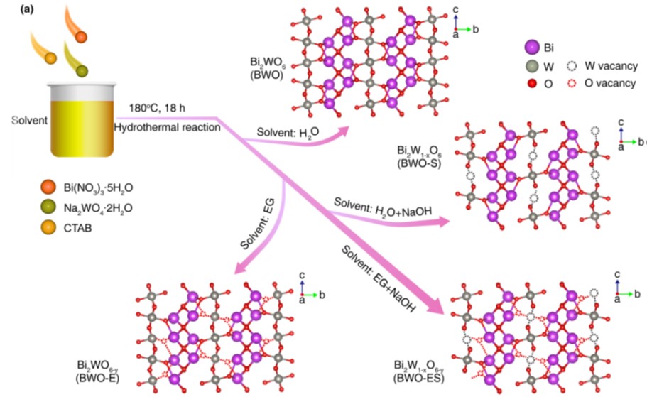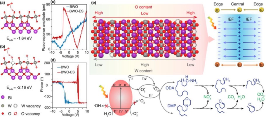 中國科學(xué)院青海鹽湖研究所輕合金與稀散元素分離課題組根據(jù)鉀鹽浮選藥劑性質(zhì)特點,聚焦綠色高效處理的研究需要,結(jié)合高原地區(qū)自然光輻照強度大等優(yōu)勢,優(yōu)化光催化材料缺陷工程改性策略,成功制備金屬/非金屬雙缺陷鉍酸鹽光催化材料,考察其對可見光的吸收利用,并對雙缺陷結(jié)構(gòu)改性鉍酸鹽光催化劑的催化作用機(jī)制開展深入剖析。研究發(fā)現(xiàn),在水熱制備Bi2WO6過程中加入適當(dāng)比例的還原劑(EG)和刻蝕劑(NaOH),可以實現(xiàn)“一鍋法”在Bi2WO6納米片的中心和邊緣區(qū)域分別構(gòu)筑O缺陷和W缺陷,強化提升鉍酸鹽的催化性能。機(jī)理研究發(fā)現(xiàn):在雙缺陷結(jié)構(gòu)材料(BWO-ES)中,W缺陷作為負(fù)電荷中心,O缺陷充當(dāng)局部的正電荷中心。當(dāng)這些帶相反電荷的缺陷在晶格不同位置建立時,使Bi2WO6材料的靜電偶極距由本體材料(BWO)的1.54 D提升至BWO-ES的48.15 D,促使材料的內(nèi)建電場強度提升2.74倍,為光生電子-空穴對的有效分離提供了內(nèi)部驅(qū)動力,從而抑制光生載流子的復(fù)合,表現(xiàn)的瞬態(tài)熒光壽命由BWO的1.61 ns提升至BWO-ES的2.63 ns。此外,O缺陷的構(gòu)筑降低了材料的帶隙(2.78 ev→2.54 eV),拓展了材料的光響應(yīng)范圍(446 nm→488 nm)。在可見光(λ≥400 nm)照射下,BWO-ES對十八胺(ODA)和十二烷基嗎啉(DMP)的降解速率分別達(dá)到13.31 mg/L·h和14.40 mg/L·h,是本體BWO材料降解速率的3.64倍和3.59倍,可實現(xiàn)鹽溶液中ODA、DMP的完全礦化。