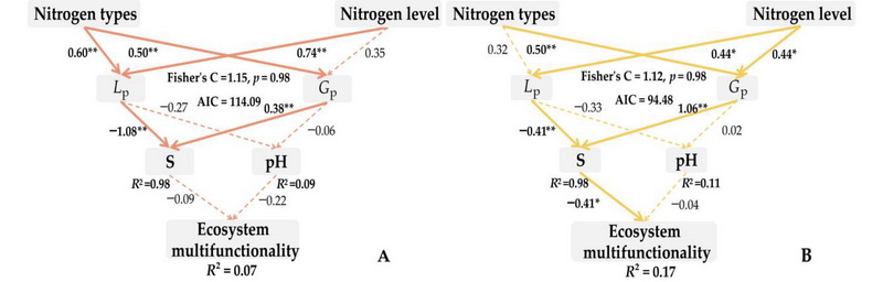 圖2 分段式結(jié)構(gòu)方程模型展示了各變量對(duì)生態(tài)系統(tǒng)多功能性的影響(A 長期氮添加,B 短期氮添加)