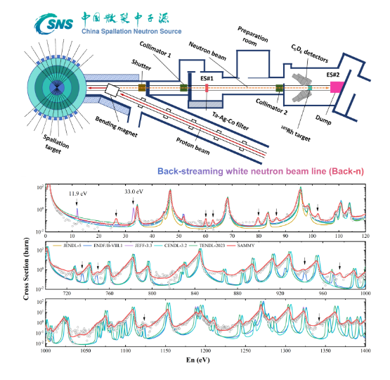 圖1: CSNS Back-n束線中子俘獲反應(yīng)實驗布局、103Rh(n,γ)反應(yīng)實驗截面值與不同評價庫的比較