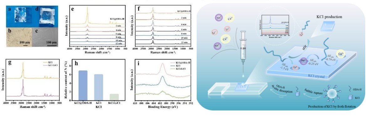 研究發(fā)現(xiàn),陽離子種類顯著影響ODA-H的脫附效果,其中Li+的促進作用最明顯。通過原位拉曼光譜驗證,明確了脫附效果由Li+的主動作用驅動導致,且該策略在酸性、中性體系中均能穩(wěn)定起效。DFT計算結果表明,Li+可嵌入KCl晶格結構中,引發(fā)KCl表面的局部晶格形變,減弱了ODA-H與KCl表面的結合力;同時,Li+對ODA-H具有強吸附作用,可定向驅動ODA-H脫離KCl固體表面,最終實現(xiàn)高鹽體系下的高效原位去除。