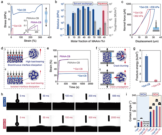 圖3. (a) 不同水凝膠的單軸拉伸應力-應變曲線。(b) 楊氏模量和韌性與MAAm含量的關系。(c) 表面納米壓痕測試曲線。(d) 抗蠕變性能測試示意圖及(e)蠕變曲線。(f) 純剪切測試示意圖及(g)斷裂能結果。(h) 水滴在BiGel-CB和IsoGel-CB表面的動態(tài)鋪展過程。(i)?超親水及水下超疏油性能評估。