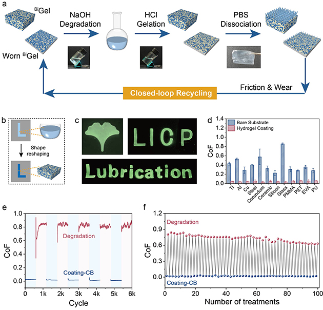 圖6.(a) 魯棒潤滑系統(tǒng)的閉環(huán)回收示意圖。(b) 形狀重塑過程示意圖。(c) 制造的不同形狀水凝膠圖案(銀杏葉、研究所徽章“LICP”、文字“Lubrication”)。(d) 水凝膠涂層與相應裸基底摩擦系數的對比。(e) 降解-重建循環(huán)過程中的摩擦系數曲線及(f)平均摩擦系數值對比(以玻璃為基底,“處理次數”以奇數次代表涂層、偶數次代表降解來表征)。