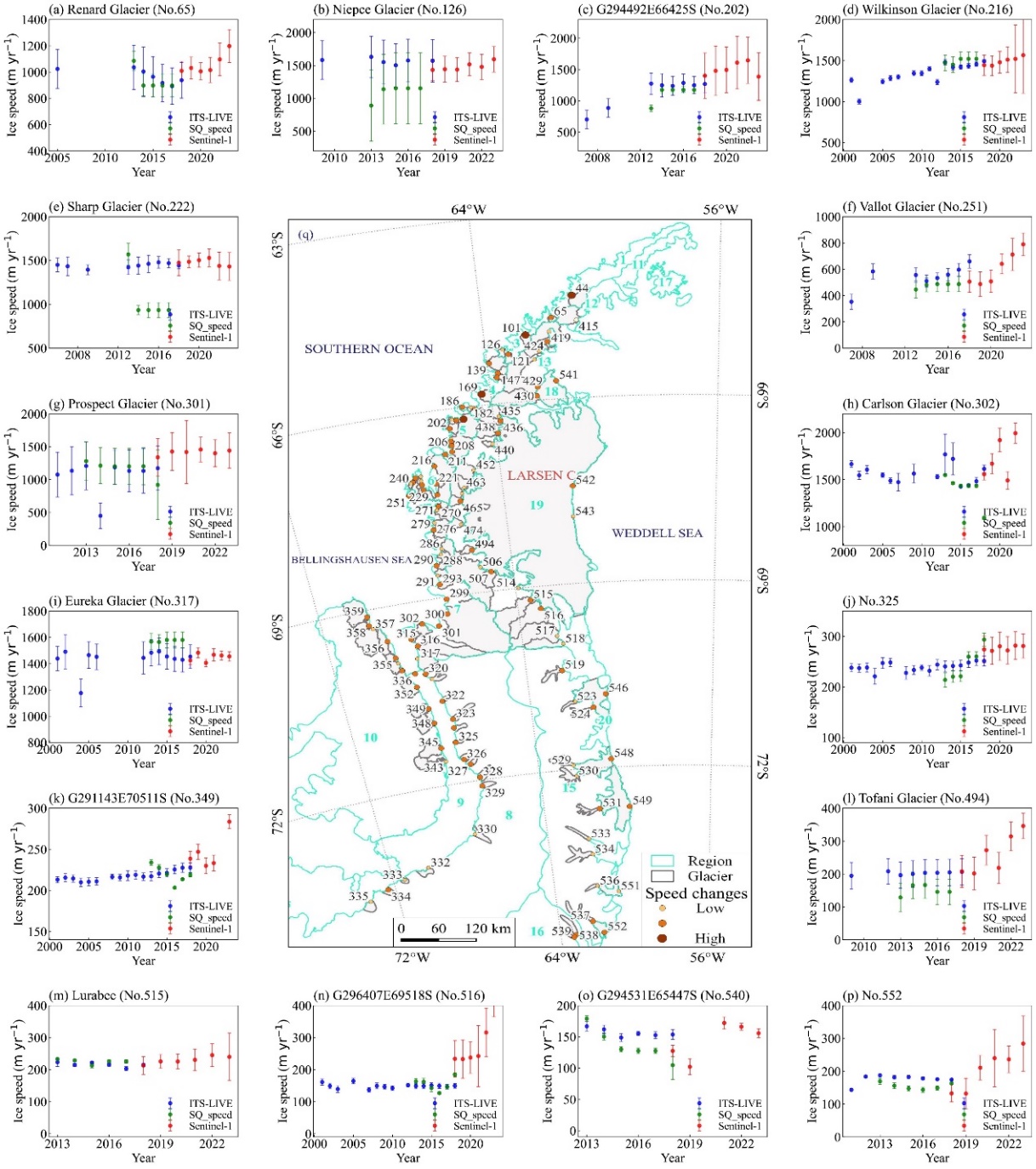 中國科學院西北生態(tài)環(huán)境資源研究院冰凍圈科學與凍土工程全國重點實驗室康世昌研究員團隊,通過2018–2023年Sentinel-1 SAR影像反演獲得6181組有效冰川流速數(shù)據(jù),系統(tǒng)揭示了南極半島冰川流速的時空變化特征及空間差異規(guī)律。
