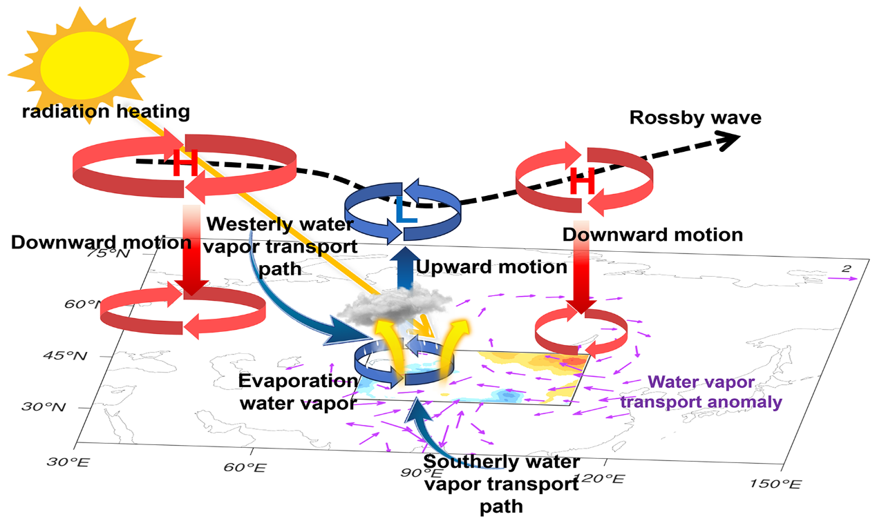 研究進(jìn)一步揭示,大尺度氣候背景場變化為局地水循環(huán)增強(qiáng)提供了有利條件。當(dāng)前處于正相位的北大西洋多年代際振蕩(AMO),通過激發(fā)跨歐亞大陸的羅斯貝波列,增強(qiáng)西北地區(qū)上空水汽輻合、抑制水汽向東輸出,為降水增加創(chuàng)造了關(guān)鍵動力條件。