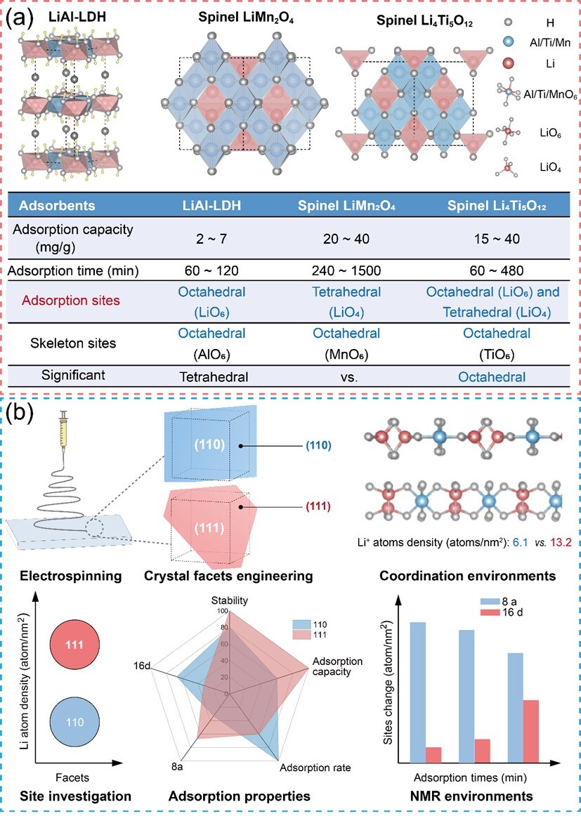 在提高吸附容量方面,研究團隊通過表面配位環(huán)境(coordination environment)的調(diào)節(jié)策略,即不同晶面上四面體與八面體配位點分布的精確調(diào)控,實現(xiàn)對鋰離子吸附動力學與容量的協(xié)同控制。同時揭示了鋰離子在材料中的遷移機制:鋰離子首先進入四面體位點作為“擴散入口”,隨后逐步遷移至更穩(wěn)定的八面體位點實現(xiàn)儲存。闡明了富含四面體位點的(110)晶面能夠降低鋰離子進入材料結(jié)構(gòu)的能壘,使鋰離子快速進入材料內(nèi)部,從而顯著提升吸附速率;而具有更均衡配位環(huán)境的(111)晶面則能夠提供更穩(wěn)定的鋰離子儲存位點,從而實現(xiàn)更高的平衡吸附容量。該研究從原子尺度闡明了配位環(huán)境對鋰離子吸附行為的調(diào)控機制,為高容量吸附材料設(shè)計提供思路。